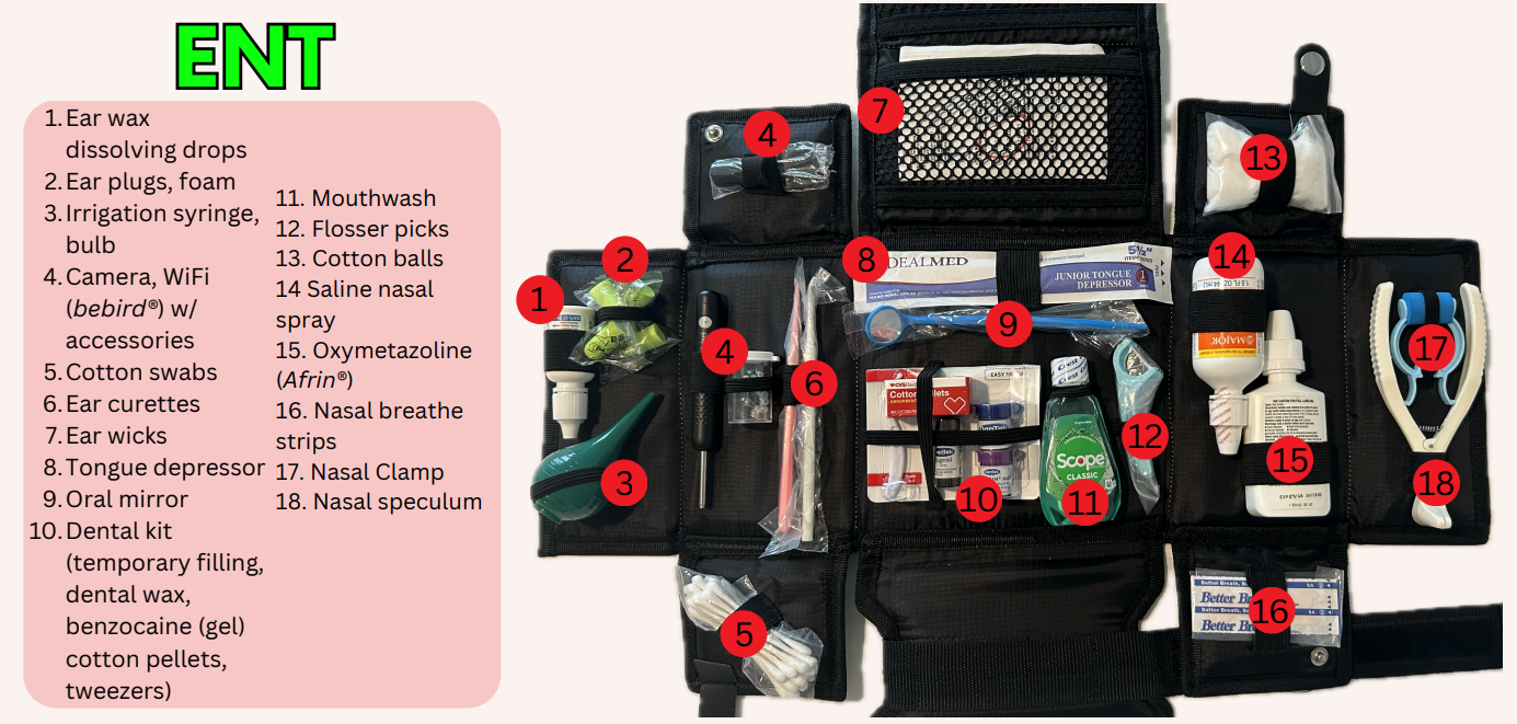 ENT support includes nasal clamps, ear wax curettes, wicks, saline sprays, and a rechargeable WiFi scope. From stubborn nosebleeds to impacted cerumen, this kit ensures visual and physical access to narrow passages. Request a refill for any specific item within this kit.