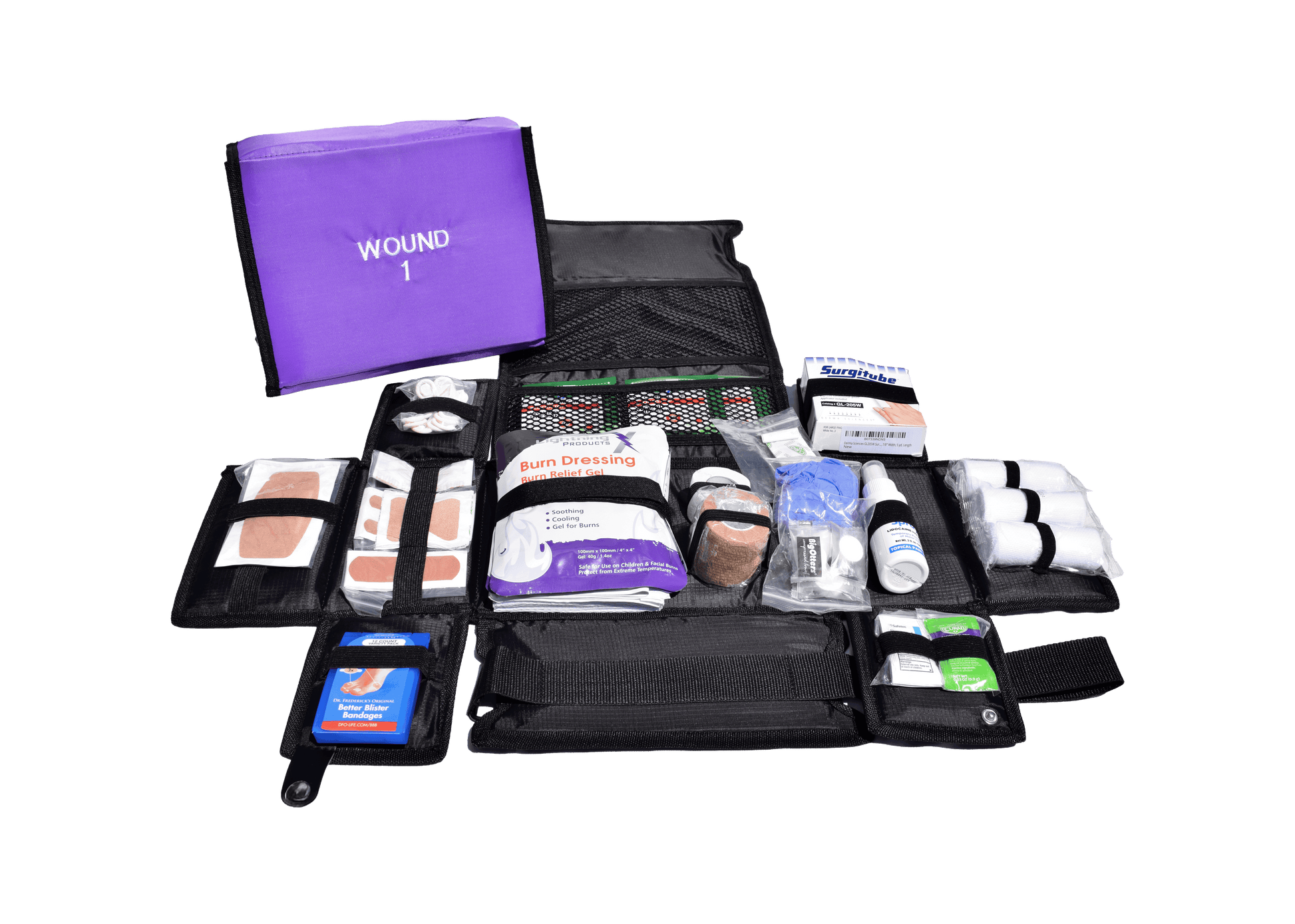 Basic wound care: assorted bandages, nonstick gauze, petroleum dressings, burn gel, and blister coverage. Designed for abrasions, minor burns, and cuts in the field. Includes a drape for controlled, clean work. Request a refill for any specific item within this ki